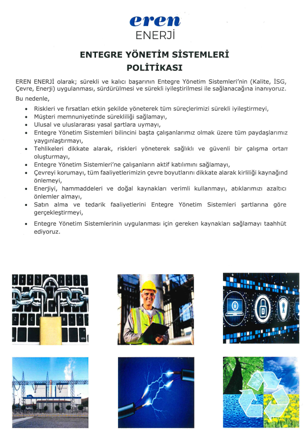 Eren Enerji; enerji sektöründe örnek ve lider bir şirket olma vizyonu doğrultusunda, kurumsal yapısını, “sürekli iyileştirme” ilkesi ile sürdürdüğü Kalite Yönetim Sistemi, İş Sağlığı ve Güvenliği Yönetim Sistemi, Çevre Yönetim Sistemi, Bilgi Güvenliği Yönetim Sistemi ve Enerji Yönetim Sistemi ile geliştirmektedir.